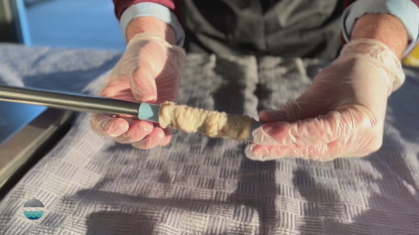 Gebrauchsanweisung: Vor dem Gebrauch weichen Sie bitte den von Ihnen abgespülten Darm mindestens 30 Minuten in lauwarmen Wasser ein. Die Wassertemperatur sollte idealerweise 30° C betragen. Entfernen Sie bitte nicht den aufgefädelten Darm vom Röhrchen für den Einweichvorgang. Nach dem Einweichen entfernen Sie die Gummihalterungen und schieben Sie den Darm auf Ihr Füllrohr.